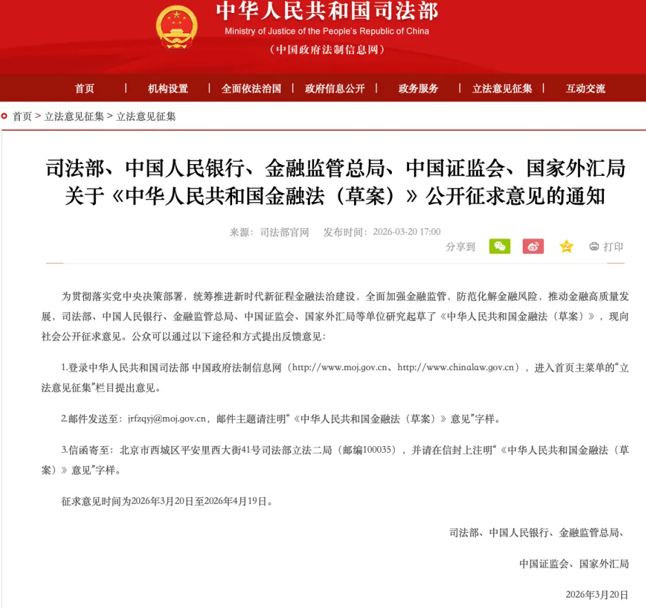 3月20日,司法部、中国人民银行、金融监管总局、中国证监会、国家外汇局在官网公布《中华人民共和国金融法(草案)》(以下简称草案),并向社会公开征求意见。征求意见时间为2026年3月20日至2026年4月19日。